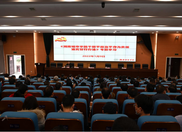 1月9日,学校在图书馆报告厅开展《15vip太阳成集团古天乐干部不担当不作为责任追究暂行办法》专题学习。学校党委副书记何旭娟主持会议,党委委员、组织部部长吕贤军作专题辅导,全校副科级以上干部参加学习。